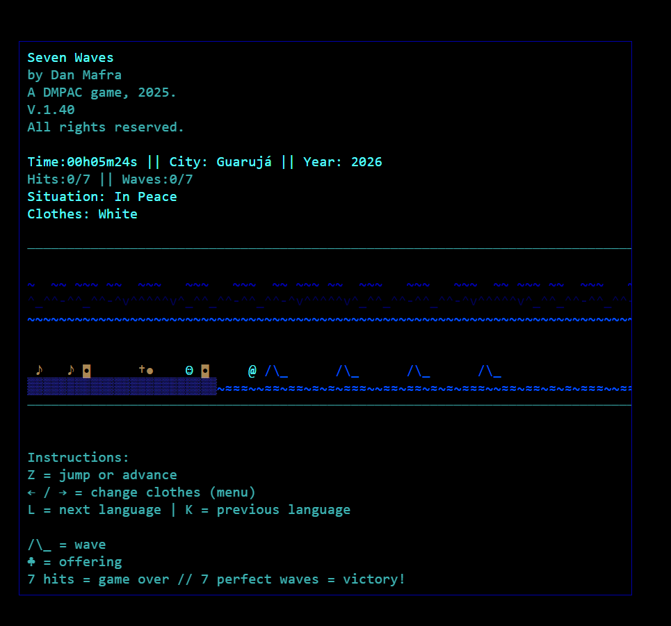 Seven Waves (Sete Ondas) is a small ASCII art microgame inspired by the Brazilian New Year tradition of jumping seven ocean waves.
